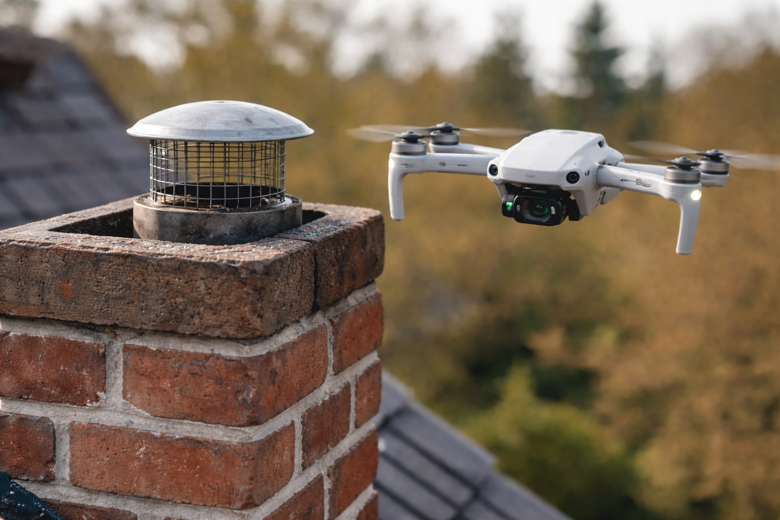 Met mijn drone controleer ik veilig en snel uw vonkenvanger, het loodwerk en de staat van de schoorsteen.